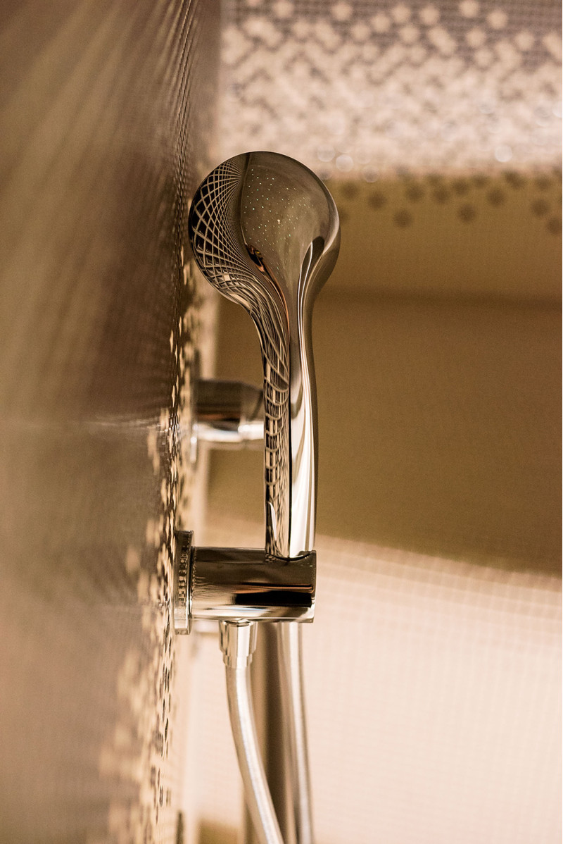 - Pod lôžkami sú inštalované svietidlá odolné voči vlhkosti a teplote. Pre nástenné svietidlo bol v rohu zvolený zhodný kryt z čierneho jelšového dreva.