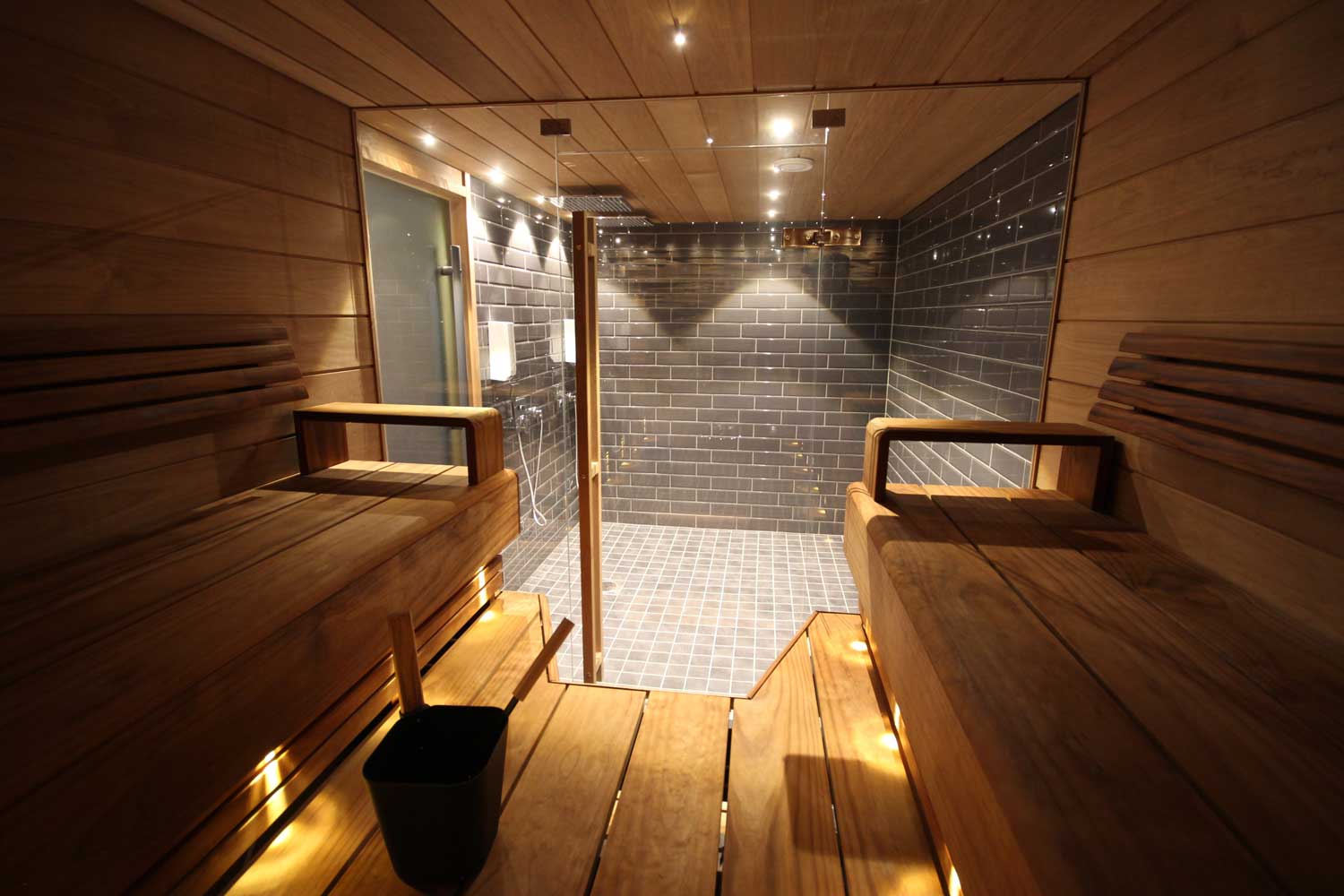 • Sauna (fínska sauna) je suchovzdušná sauna, kde je vlhkosť vzduchu cca 5-25 percent a teplota stúpa na 70-110 stupňov Celzia. Optimálna teplota je 80-90 stupňov. Teplo v saune sa reguluje nalievaním vody na nahriate kamene. Odporúča sa vyhrievať sa v ňom 2-3 krát až do maximálneho spotenia. Pred prvou prechádzkou sa telo navlhčí v sprche a po opustení sauny sa umyje pod studenou sprchou alebo ošpliecha vodou. Sauna sa odporúča pre ľudí trpiacich alergiami, zápalmi dutín, artritídou, migrénami, bolesťami chrbta. Malým deťom, tehotným ženám a starším ľuďom sa odporúča, aby ho nezneužívali.